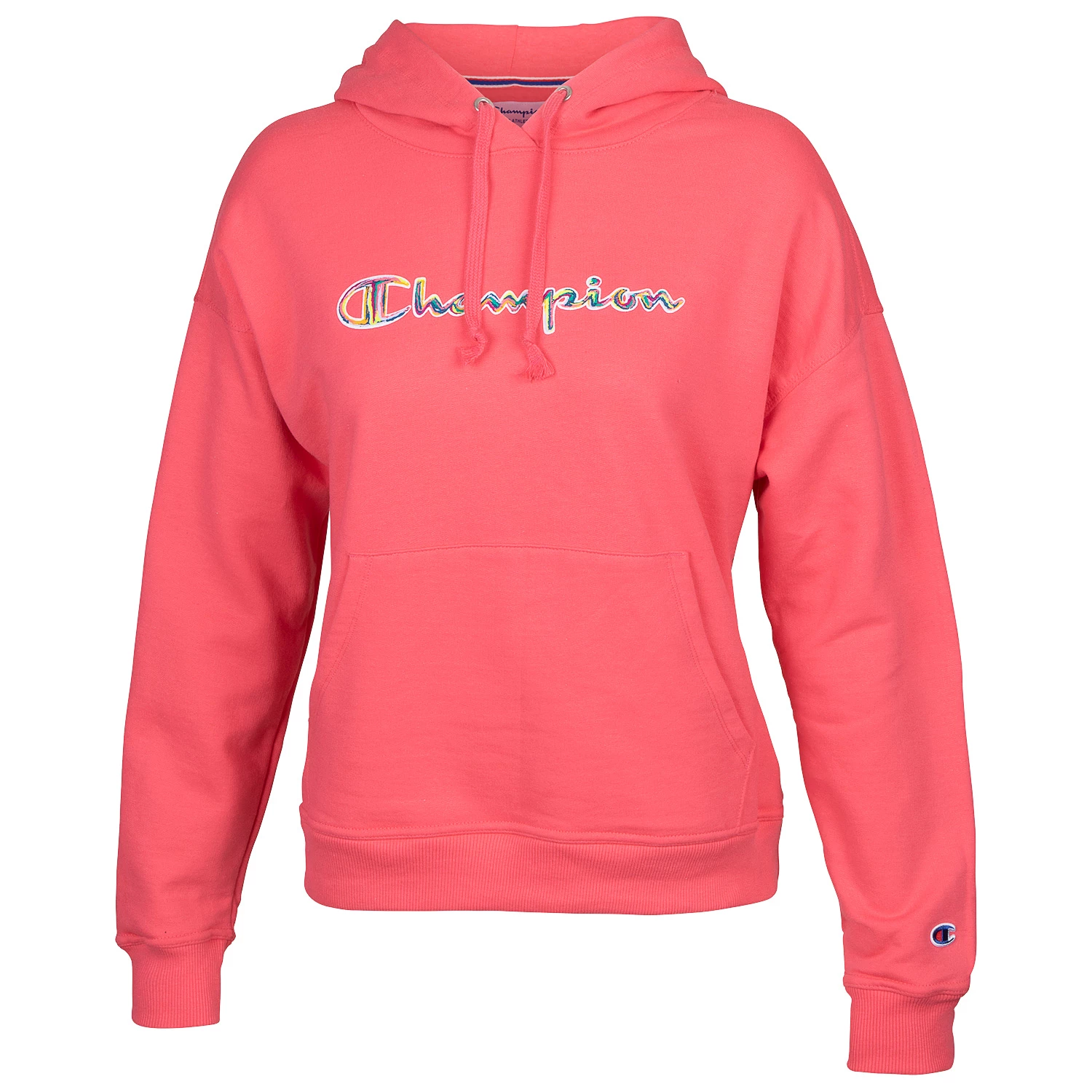 The Champion Powerblend Painterly Pullover Hoodie has a painted Champion script graphic. Made with 9 oz. soft and comfortable cotton/polyester fleece that features a percentage of recycled fibers. Features a rib cuff and waistband, front kanga pocket, and a jersey lined hood.